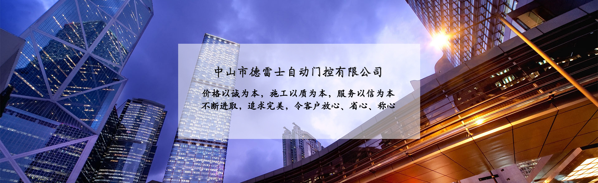 中山市德雷士自動門控有限公司代理中山松下自動門、中山松下感應門、及其旗下品牌松下(Panasonic)自動門、旋轉門、型材門、松下門禁系統、地彈簧、閉門器等系列產品。 松下Panasonic一直致力于憑借不斷創新的技術營造為各個區域的用戶做出最佳解決方案,在自身領域處于領先地位;松下自動門控系統廣泛應用于寫字樓、機關單位、大型企業、學校、醫院、智能小區等領域。在用戶心中有良好的口碑及信譽度。 松下(Panasonic)自動門控系統包含:自動感應門、旋轉門、90度平開門、圓弧型門、重疊門、緊急逃生門、醫用門、氣密門、鋁合金型材門、松下門禁系統、家庭智能鎖、地彈簧、閉門器等系列產品。 德雷士自動門控有限公司從事智能門控十余載,精英匯聚;公司具有完善的管理體系,對每位客戶都進行檔案管理,跟蹤服務,定期回訪,終生維修。提供急修12小時解決,一般維修48小時解決的服務,完全能解決您的后顧之憂。 公司的質量方針 科學管理確保的工程質量 真誠服務贏得客戶信譽 持續創新打造企業 公司的服務宗旨 價格以誠為本,施工以質為本,服務以信為本。 實實在在做人,老老實實做事,以我們的辛苦換來客戶滿意的微笑,這就是我們的追求! 公司的目標 ...